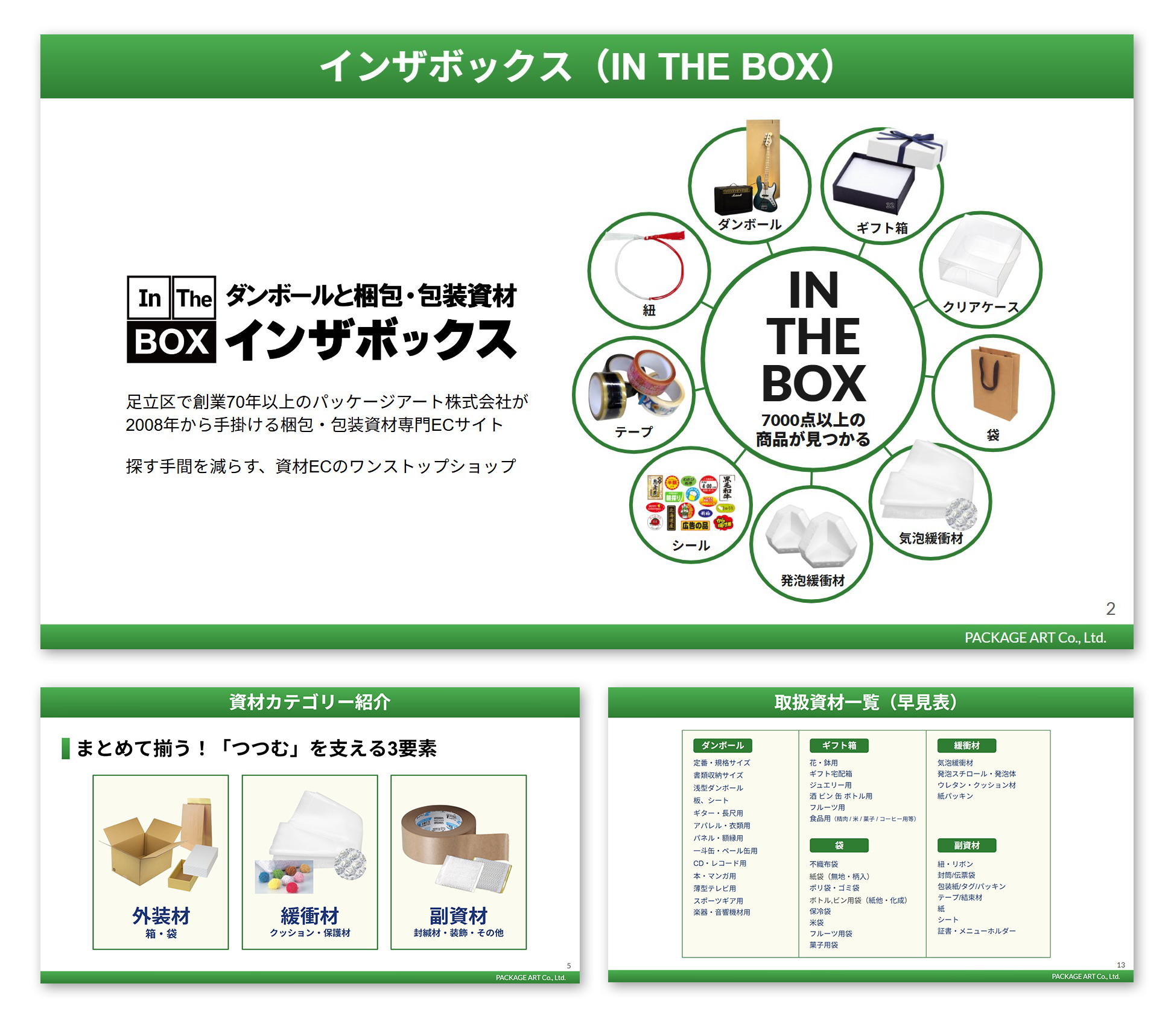 創業70年以上のパッケージ専門会社「パッケージアート」が運営するECサイト「インザボックス」で取り扱いのある梱包・包装資材を一冊にまとめました。